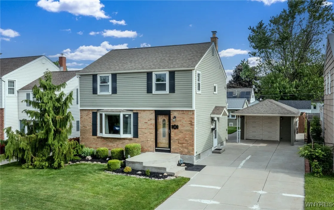 Discover this charming two-story colonial in the heart of the Town of Tonawanda! This meticulously maintained home features a spacious semi-open living area perfect for entertaining, an updated dine-in kitchen with solid surface counters and included appliances, as well as a cozy dining room and living room with a bay window and a standout family room addition that boasts a gas fireplace and French doors leading to a stunning backyard oasis. Enjoy the free-standing three-season room (new roof in 2024) on a stamped concrete patio, along with a 1.5-story work shed with electricity and a covered porch area, detached garage w/covered patio area, manicured landscaping, hot and cold-water spigots, and an additional storage shed.